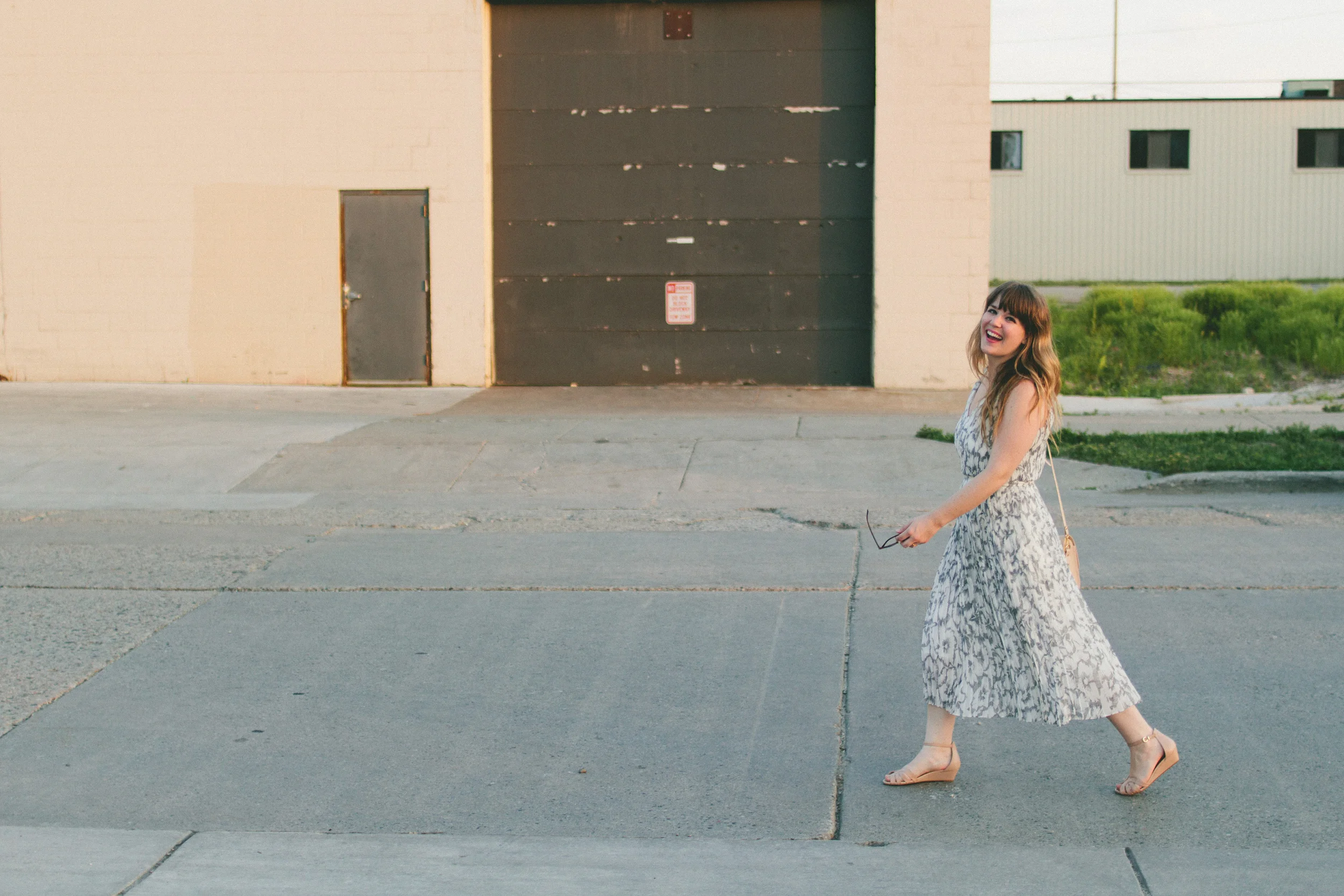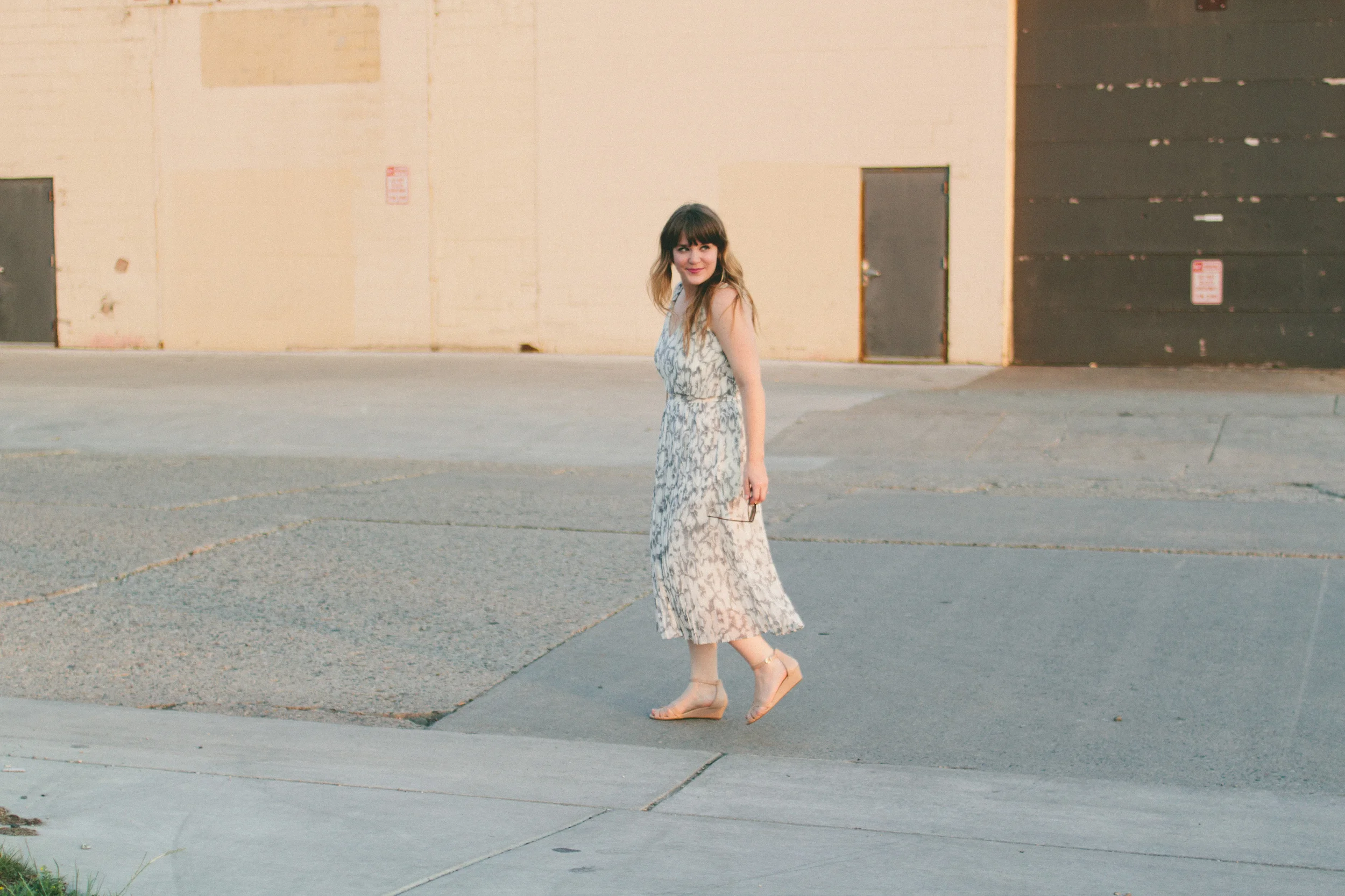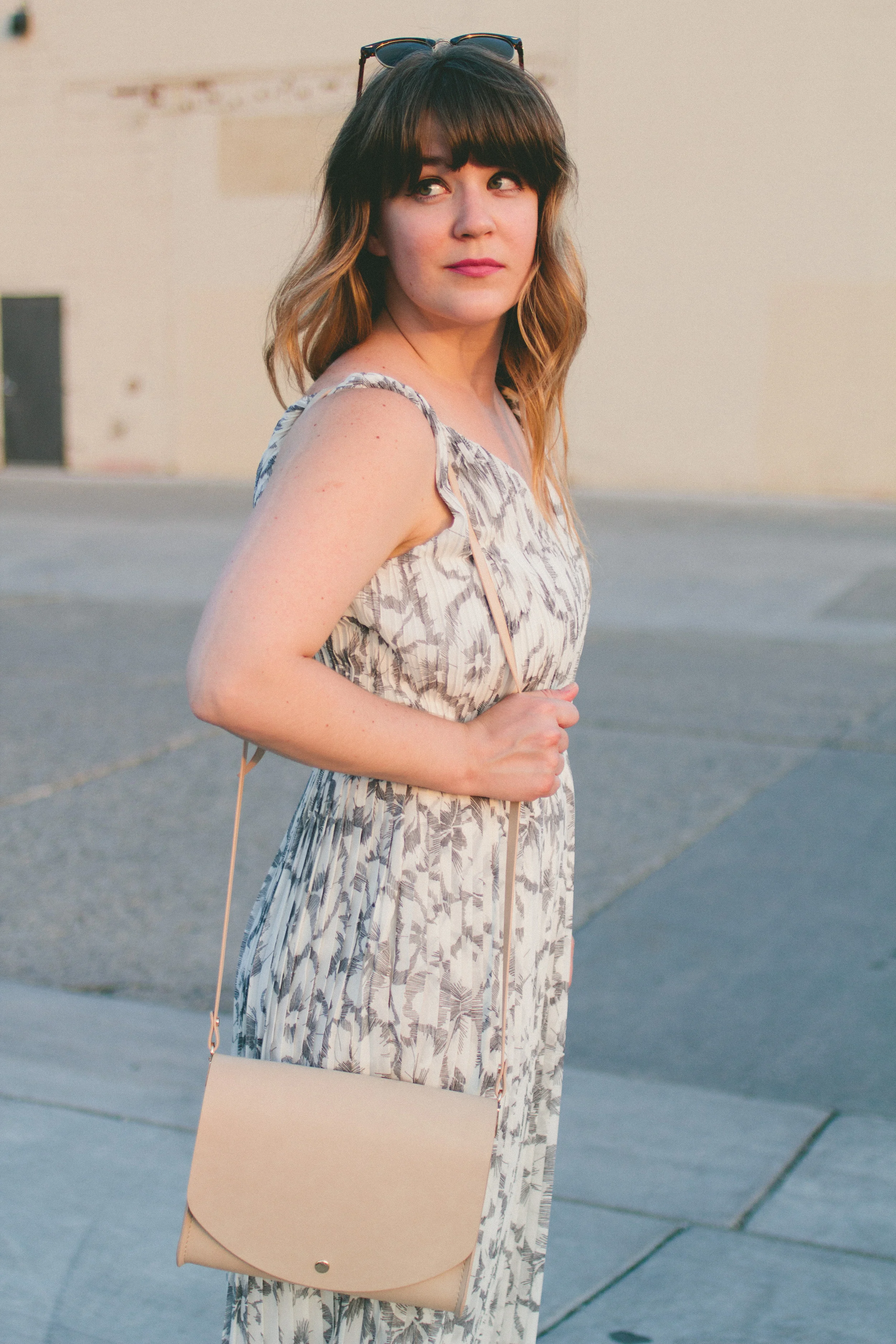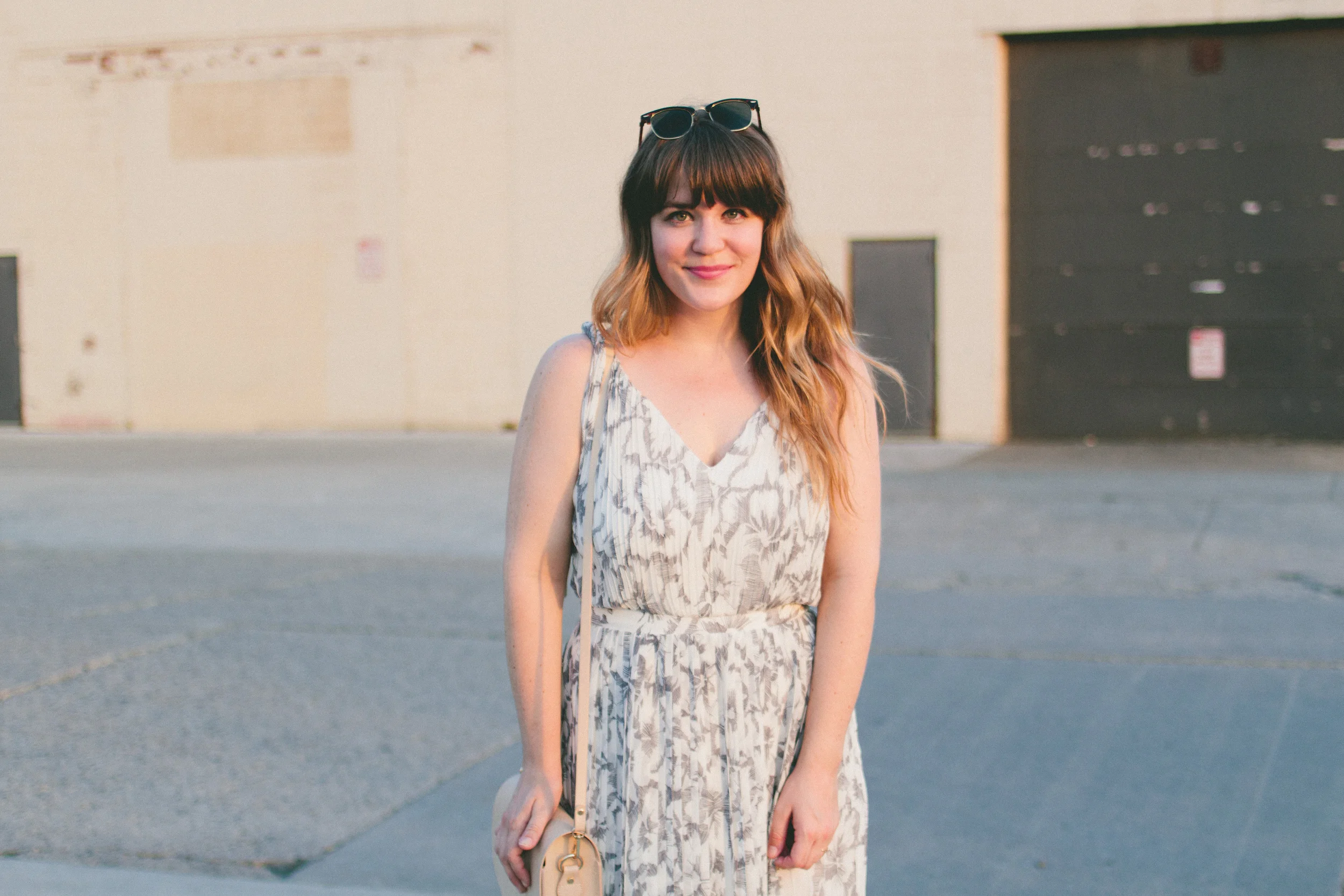 The weather lately has been a dream. Last weekend, we met up with friends at Founder's Brewing for a few drinks, and it sure felt like summer! I was excited to style my new dress from Banana Republic for a fun night out. It’s beautiful, breezy, and I received a ton of compliments on it. I can’t wait to wear this several times over the summer, sitting on patios, sipping on a cold drink. Perfection! I decided to pair it with a nude purse and wedges, loose waves, and a blush pink lip. I loved the combination of gray sketched florals and neutral shades!