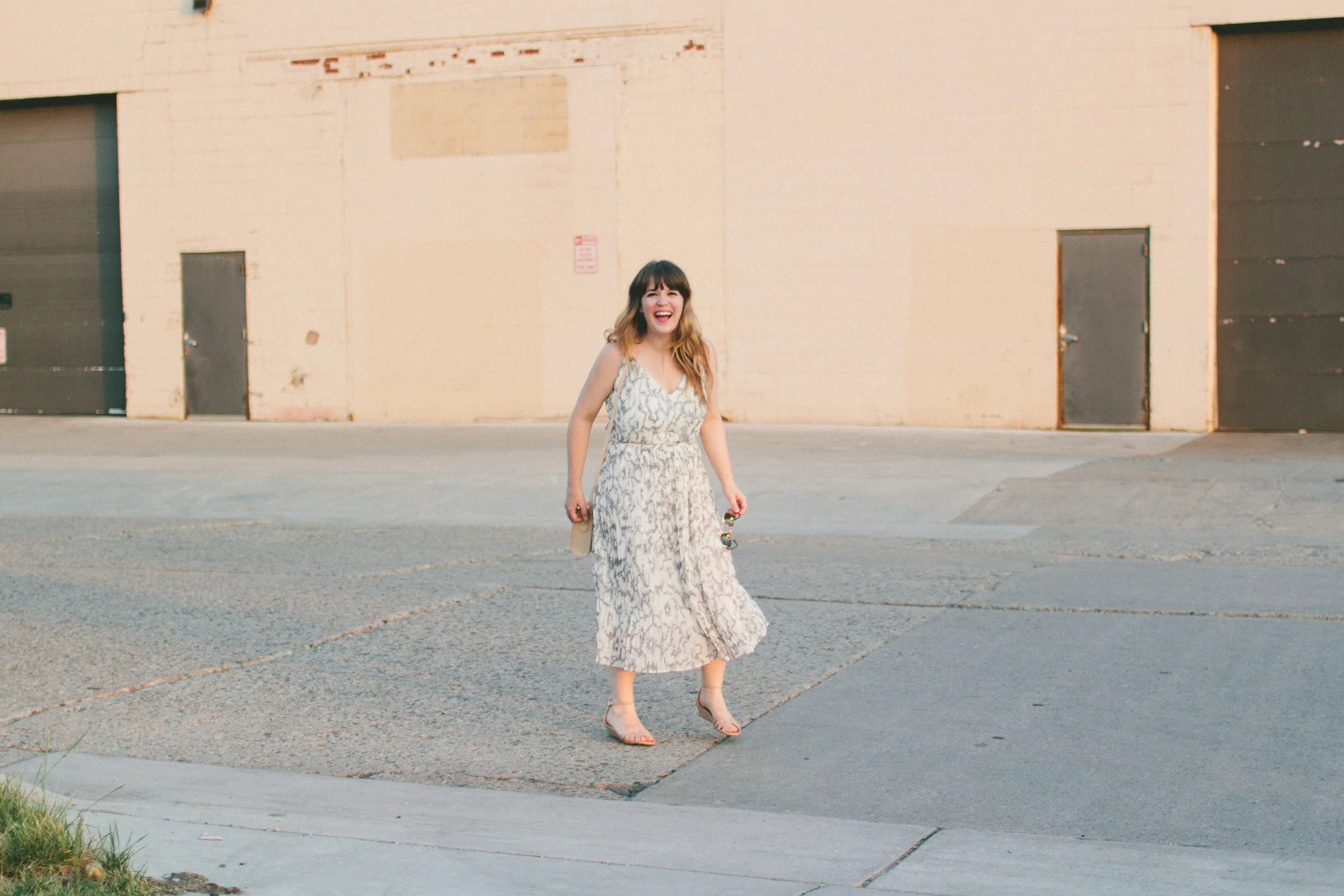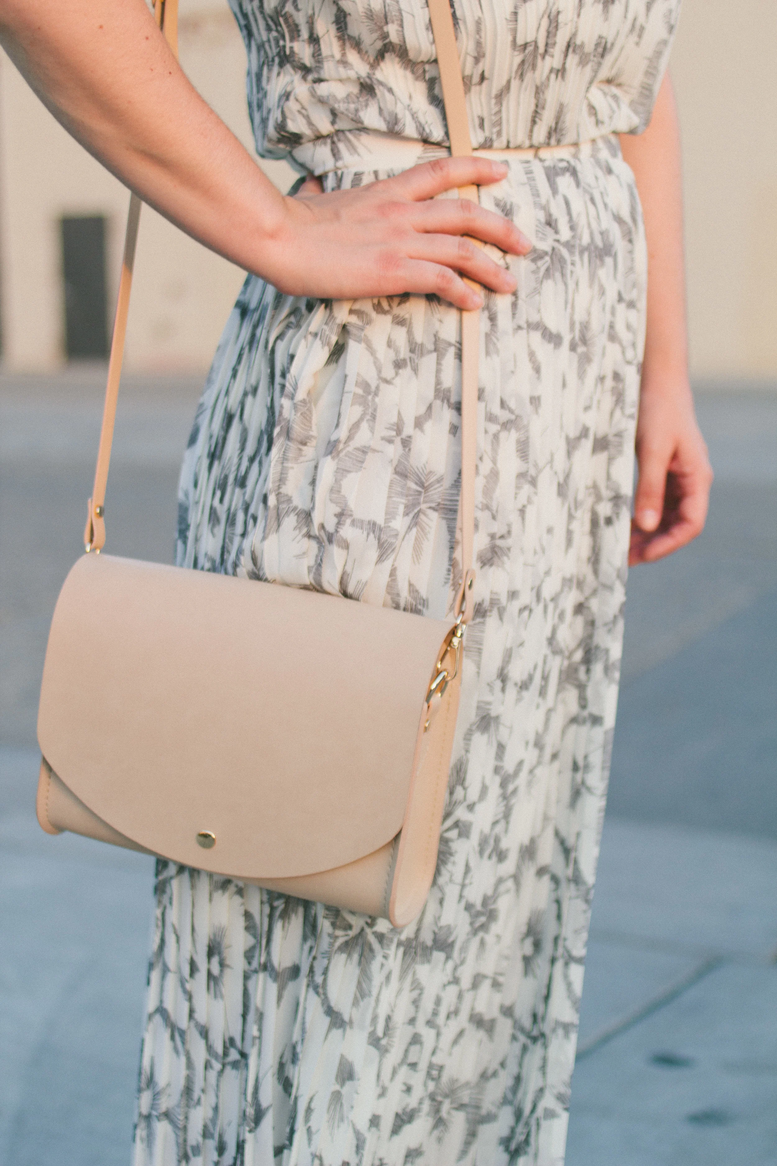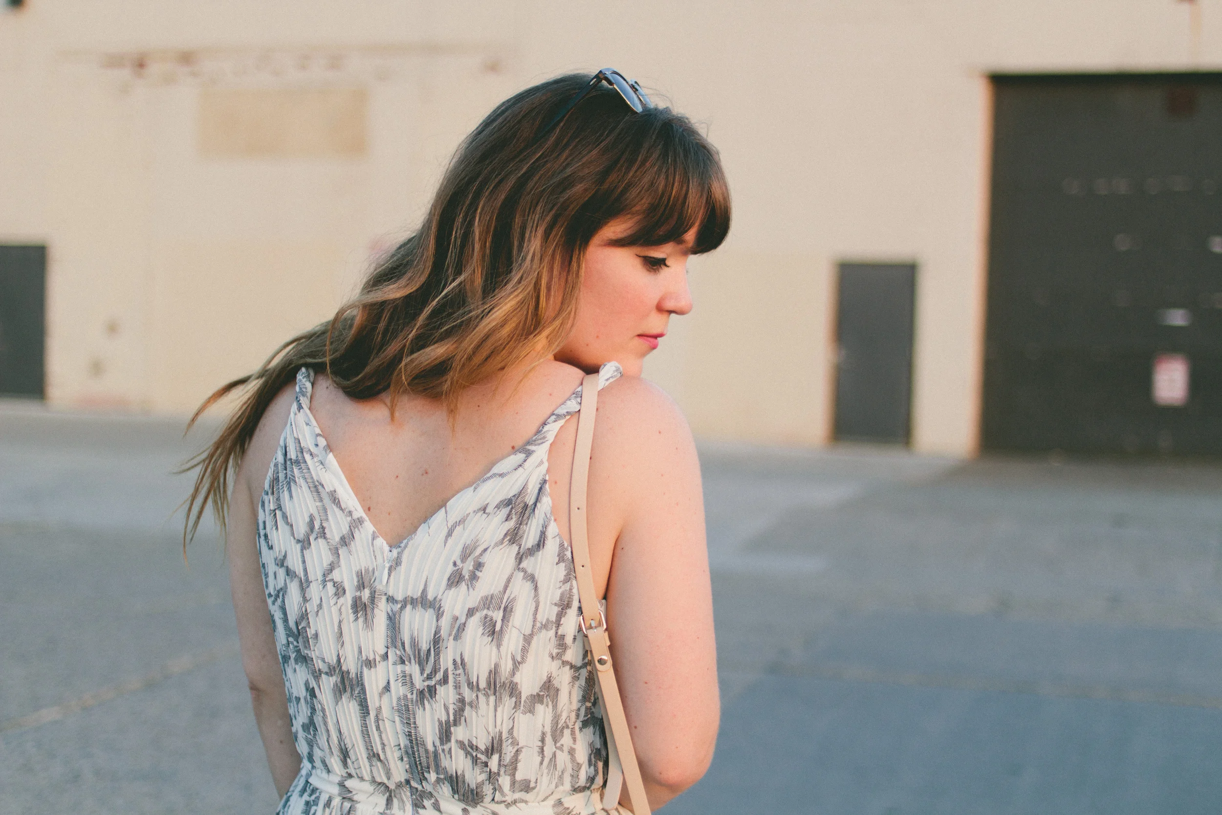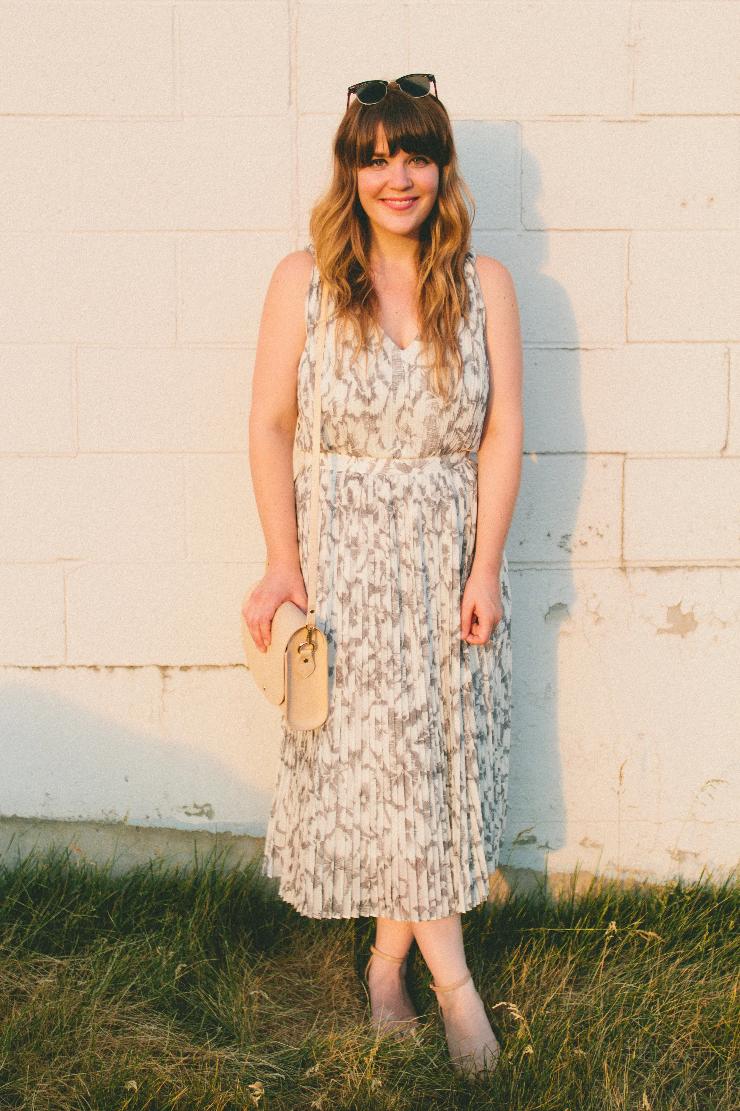 The weather lately has been a dream. Last weekend, we met up with friends at Founder's Brewing for a few drinks, and it sure felt like summer! I was excited to style my new dress from Banana Republic for a fun night out. It’s beautiful, breezy, and I received a ton of compliments on it. I can’t wait to wear this several times over the summer, sitting on patios, sipping on a cold drink. Perfection! I decided to pair it with a nude purse and wedges, loose waves, and a blush pink lip. I loved the combination of gray sketched florals and neutral shades!