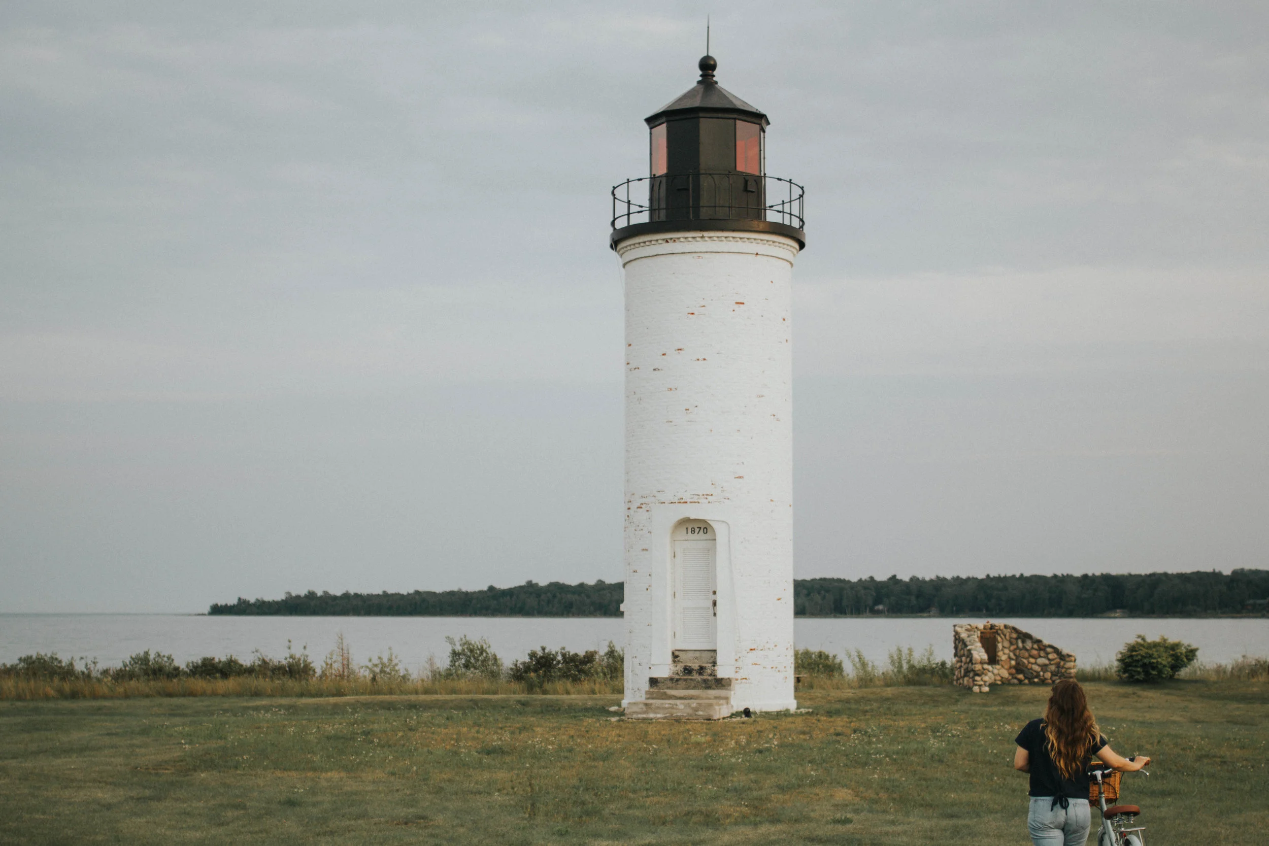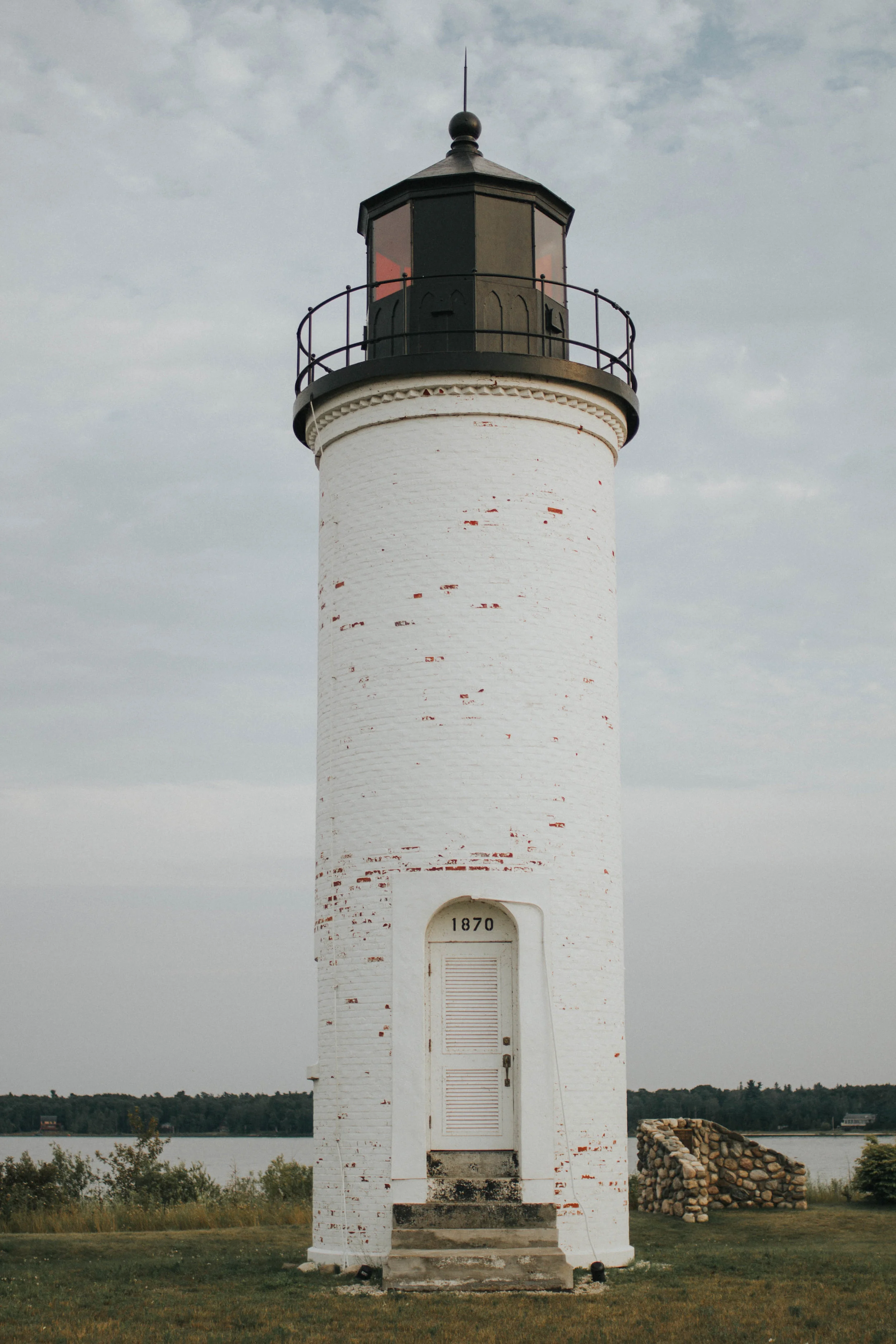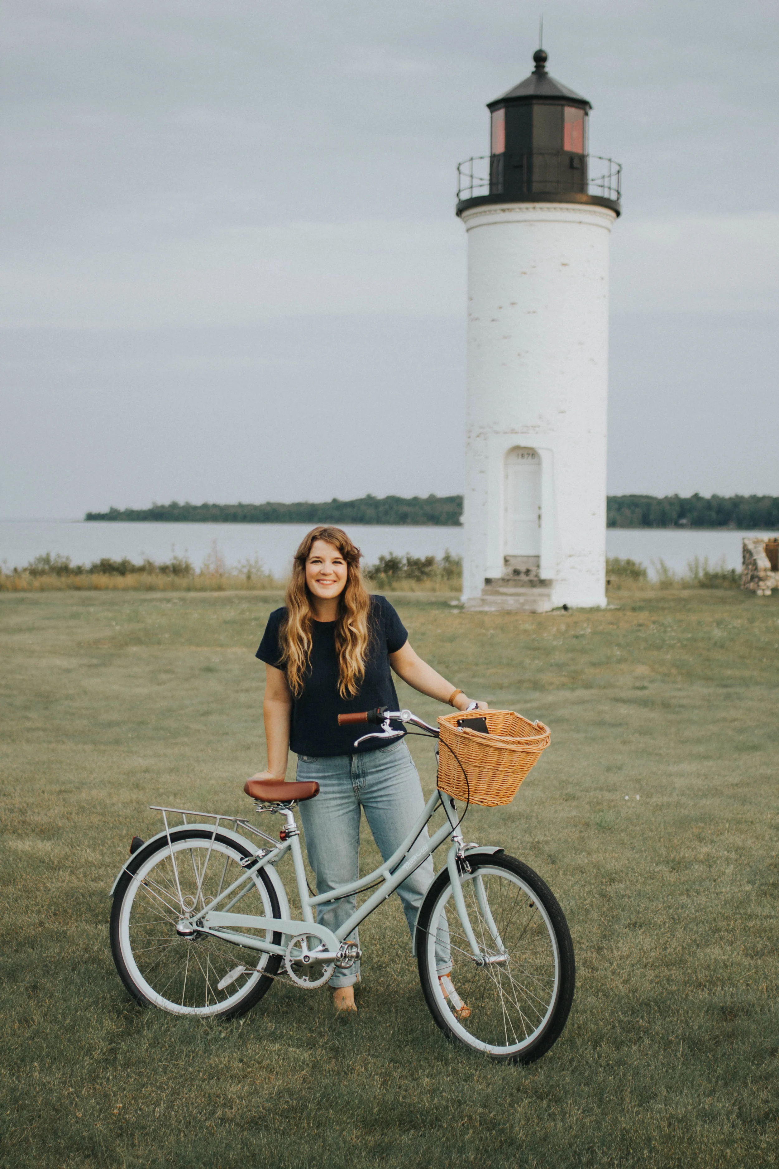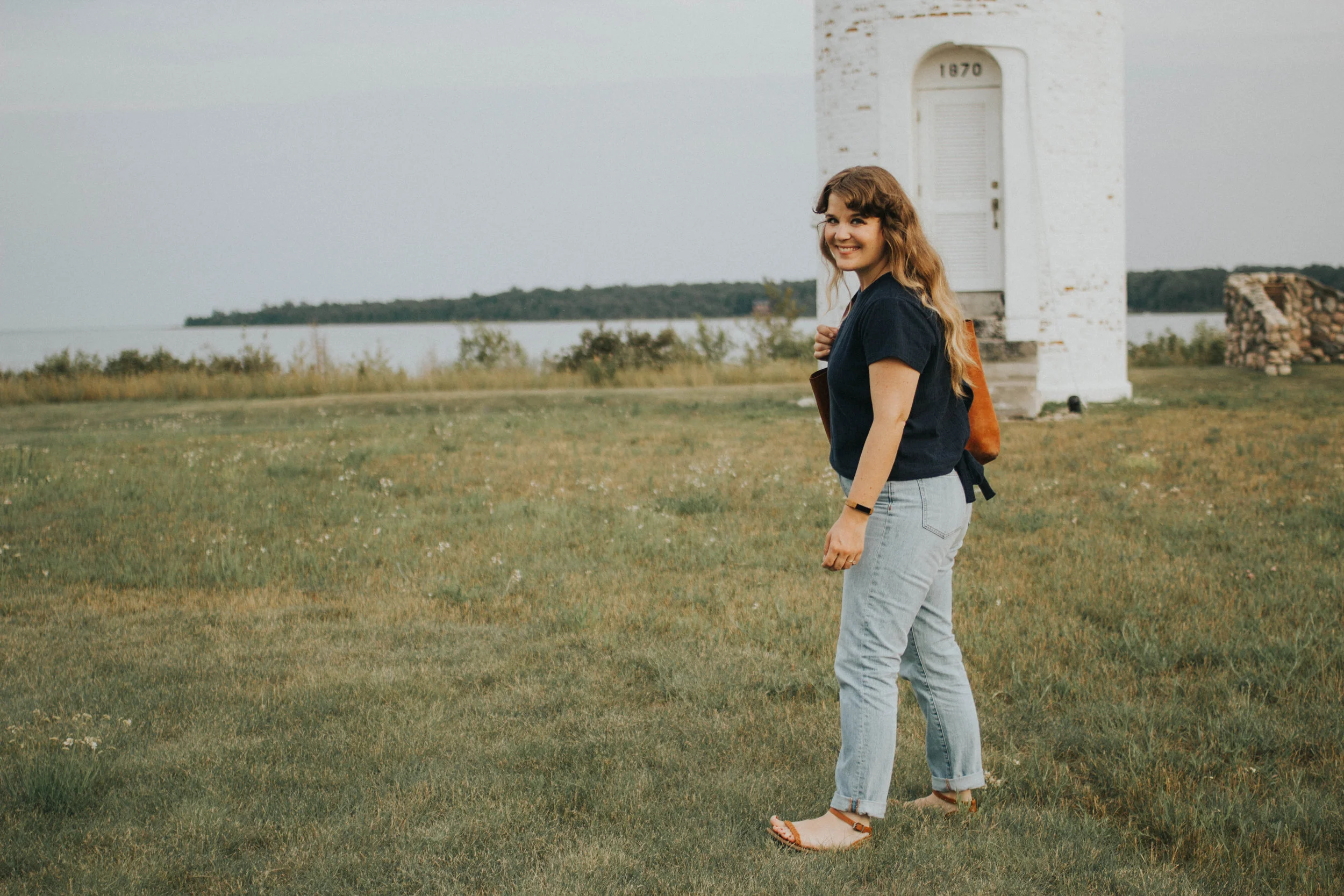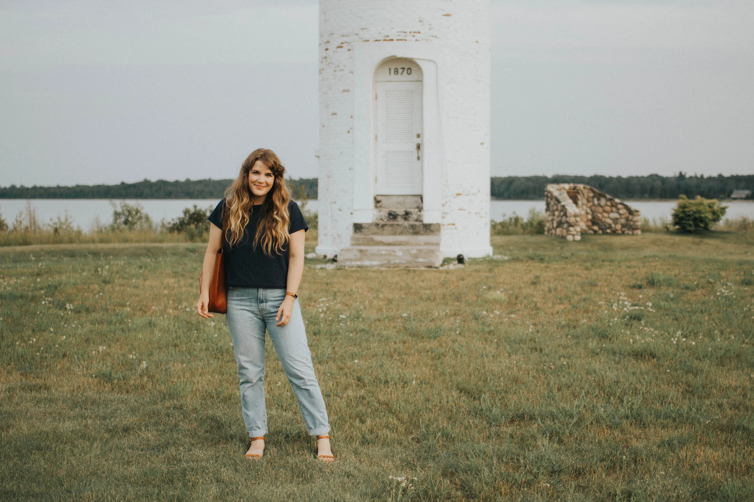 We traveled from Charlevoix to Beaver Island (in the middle of Lake Michigan) by ferry! It took about two hours, and honestly was a super nice boat ride. I loved exiting through the channel and seeing the Charlevoix Lighthouse too! That was the first lighthouse Eric and I saw right after being engaged actually! So we made it to the island, checked into our inn, grabbed dinner, and biked over to the lighthouse. I'll publish a full travel guide on what we did on the island later in the week... but for now, let's chat about the Beaver Island Harbor Light! You see it immediately (while you're on the ferry) and it's also really easy to walk/bike to from the main area of town. For whatever odd reason, I really loved this little lighthouse. It felt historic, no new expansions or builds on it, and the white structure set against the gray blue sky was just so pretty.