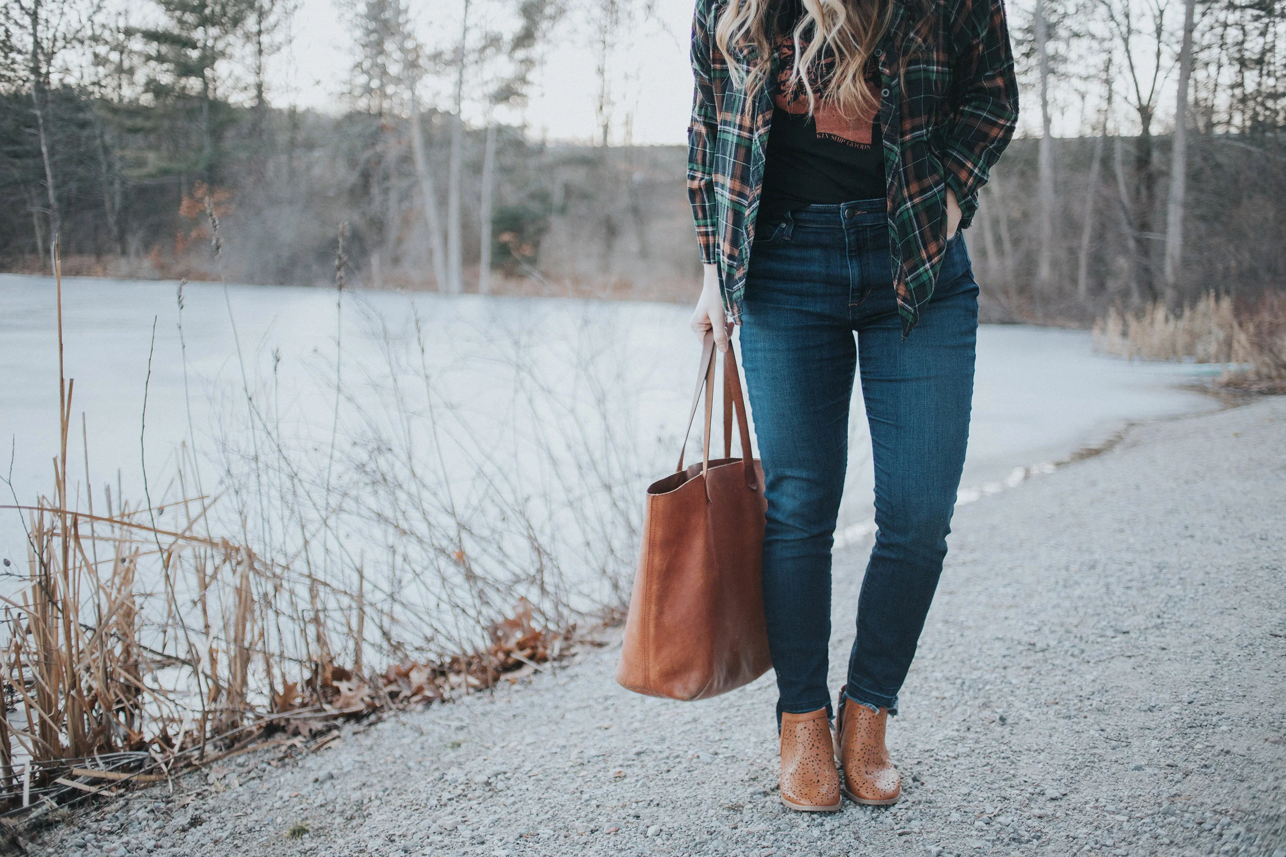 For my third look, I styled up their State of Mind No.1 Tee with an oldie (but goodie!) flannel top, my favorite pair of jeans, a pair of cognac booties, and my beloved tote. This is definitely something I'd wear while adventuring. Cozy, comfortable, rustic! This top is super cute, and I love the copper print against the black tee. I'm definitely a Kin Ship Goods fan! Be sure to hop over to their website to check out their products! They have tons of unisex clothing options, super fun gift ideas, candles, jewelry, you name it! Plus, they offer free shipping for orders over $45! Have fun shopping!