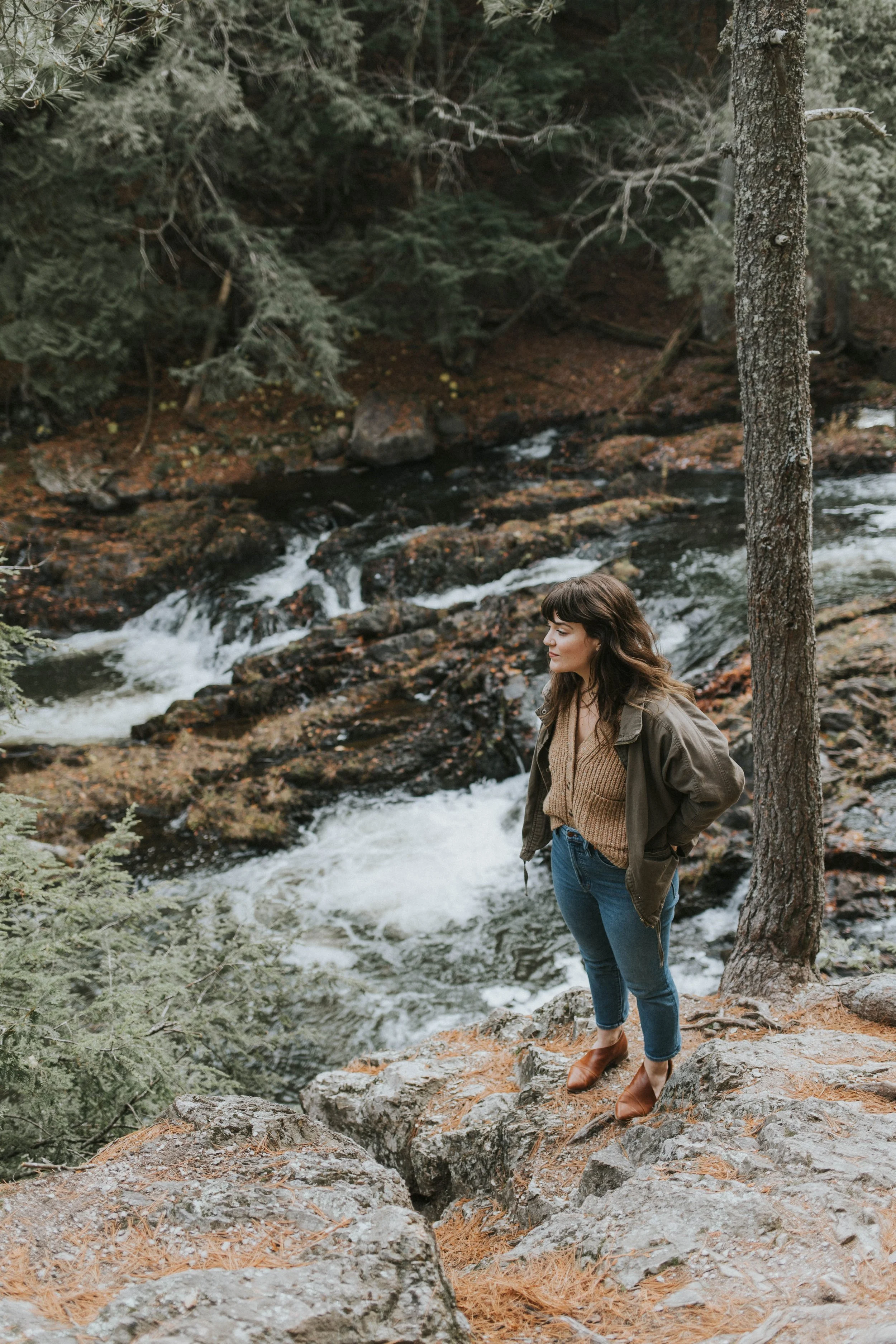 One of my favorite adventures in Marquette is to Dead River Falls! It’s a super quick and easy drive from downtown Marquette (about 14 minutes) and only 7 minutes from our local Target, haha! That’s exactly what I did on this day… stopped to Target and Ulta, made my way over to hike the falls quick, and then home to enjoy the rest of my Sunday! I love this town. But if you’re looking to get to this waterfall… Google Maps will take you right there. There’s a small parking lot, you can park there, and hike up a little gravel road (kind of steep but doable), and then just follow the trail to the wood log that says “Dead River Falls”, take that, navigate a few tree roots, and you’ll walk right up to it! Also be sure to check out Reany Falls on your way in or out too! It’s right there, and most people miss it!