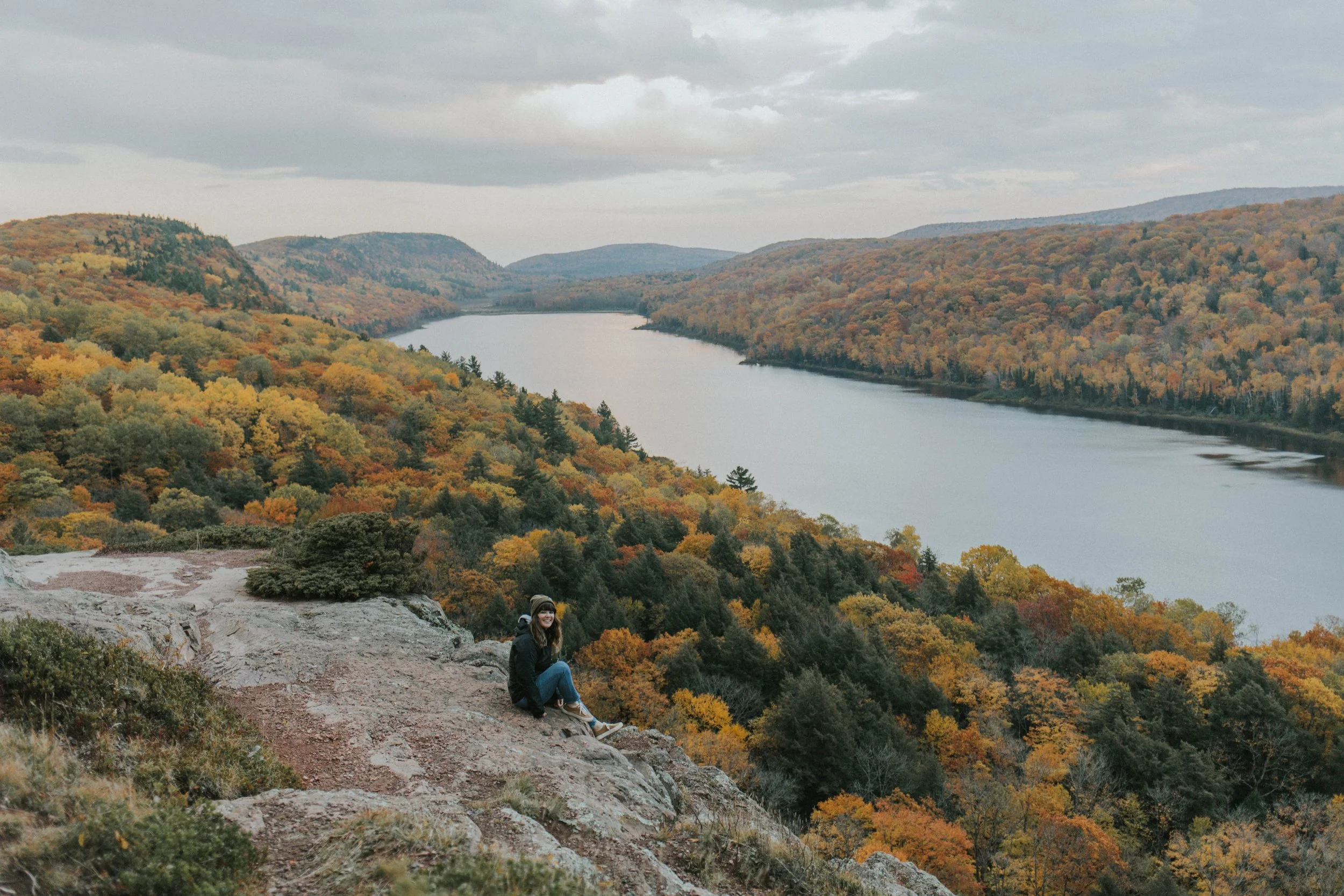One of my favorite day trips in the Upper Peninsula (which could easily turn into a weekend or a week-long trip with how much there is to do)… is in the Porcupine Mountains! I’ve made this trip every year I’ve lived in the UP now, and in autumns before that as well. I love visiting any time of year, but autumn is just… pure magic here. 🍂 Especially at Summit Peak and Lake of the Clouds. It’ll take your breath away! But read on for what I did during a day in the Porkies with my friend Kate who was visiting! It was so fun to show her some of these spots for the first time, she was just as blown away as I was the first time, and we were blessed with gorgeous autumn weather and sunshine.