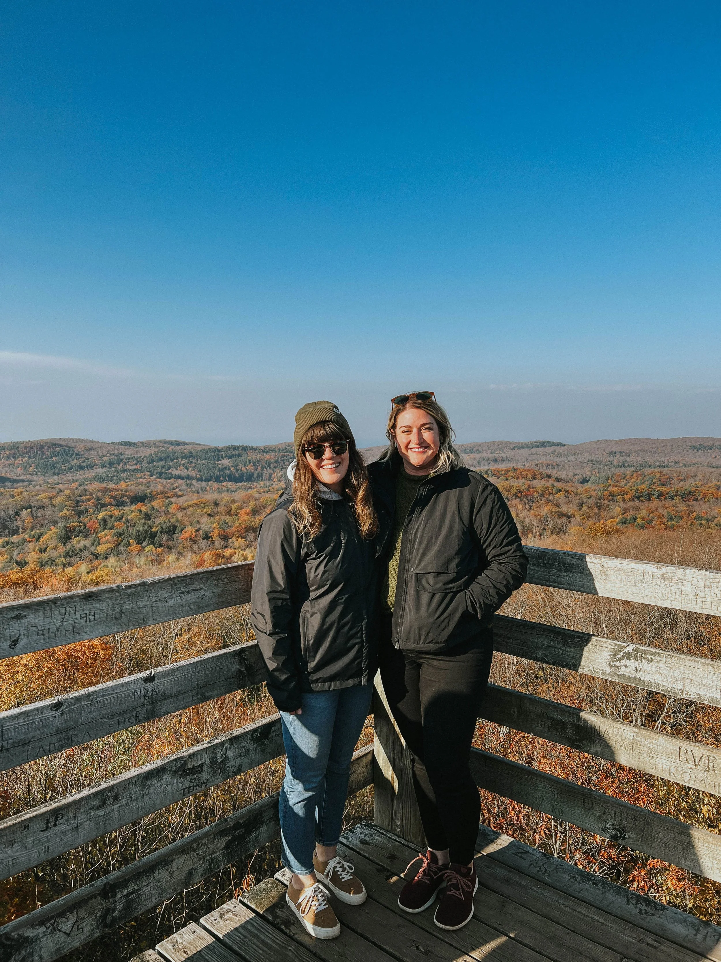 Next up, we drove into the Porcupine Mountains! I’ve been to Summit Peak before, but wanted to bring Kate for her first experience. It’s a really easy walk, plenty of parking, restrooms, etc. And the weather was literally gorgeous… the autumn forest, sunlight, the views. We were a touch past peak, but it was still very autumnal. We got to the end, climbed the observation tower, got some pictures. I spotted a “K+T” etched into the tower, which was so cute! We got a photo, and then headed back to make sure we had enough time to get to our next destination. Once you’re in the Porkies, you can spend quite a bit of time driving honestly!